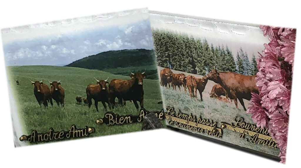 Témoignages d’affection, d’amitié, de regrets aussi, les plaques qui illustrent ces marques de considération sont parfois dessinées dans un style réaliste ou poétique. A plusieurs reprises, c’est une photo du troupeau qu’on y a fait figurer pour exprimer sa reconnaissance à celui qui a consacré sa vie à la noble profession de nourrir les autres. Chacun à sa façon, ces témoignages manifestent le respect marqué à l’éleveur disparu par sa famille, ses amis, ses collègues. Ils rendent hommage à sa connaissance du métier, à son expérience, au dur labeur auquel il s’est livré comme souvent aussi ses ancêtres avant lui durant de très nombreuses générations.